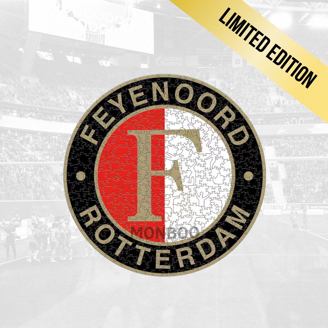 Deze stijlvolle, houten legpuzzel brengt het logo van Feyenoord op een unieke manier tot leven. Gemaakt van hoogwaardig hout, met haarscherpe laserafwerking, voelt deze puzzel luxe aan en staat ‘ie na afloop prachtig in elk interieur.